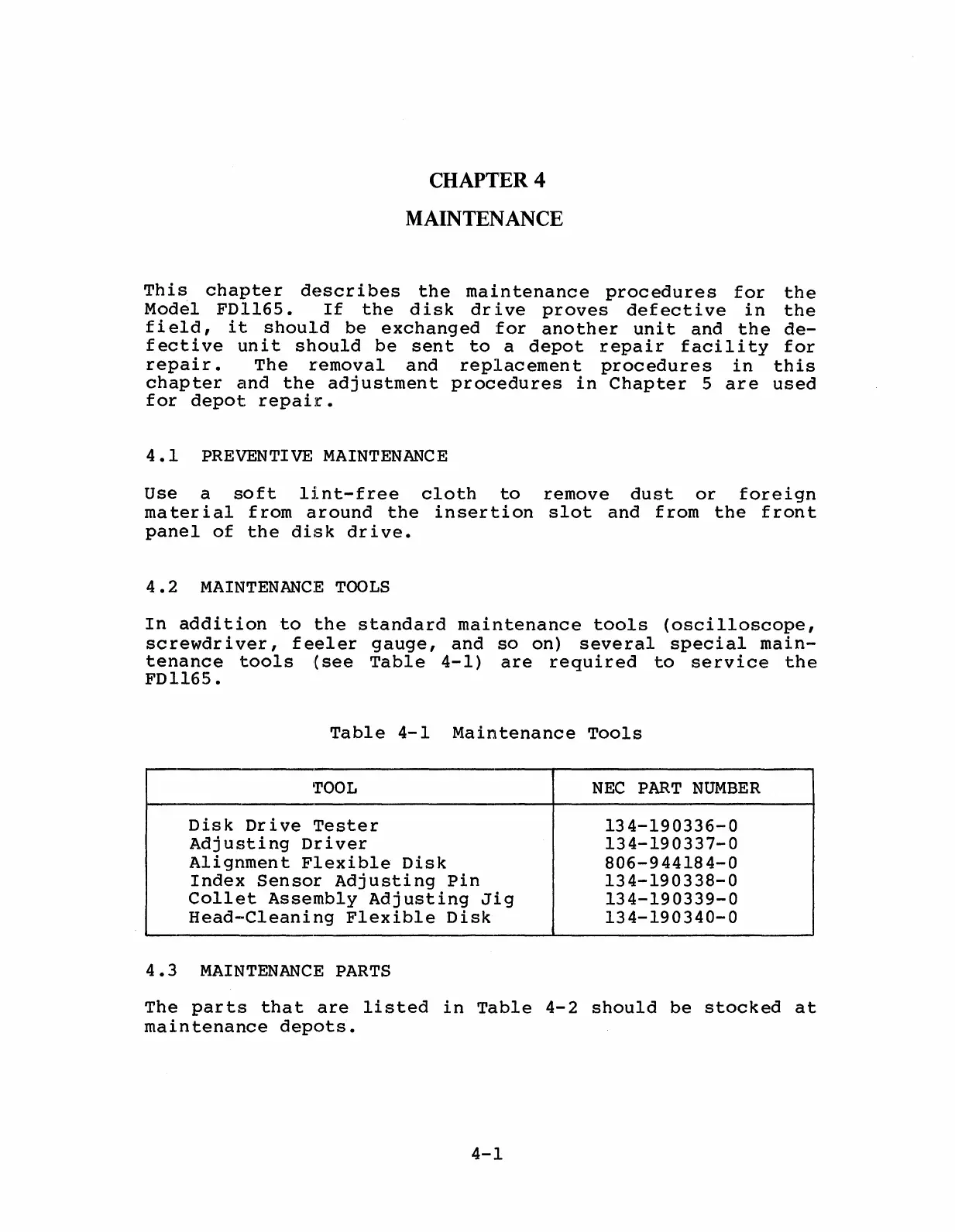 NEC FD1165 - Chapter 4 Maintenance; 4.1 Preventive Maintenance; 4.2 Maintenance Tools; 4.3 Maintenance Parts