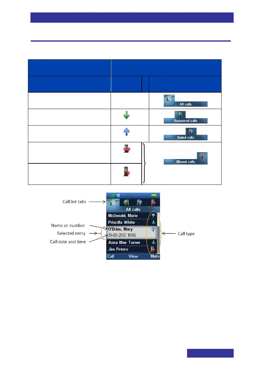 Table 7: Call type icons and Call type tabs