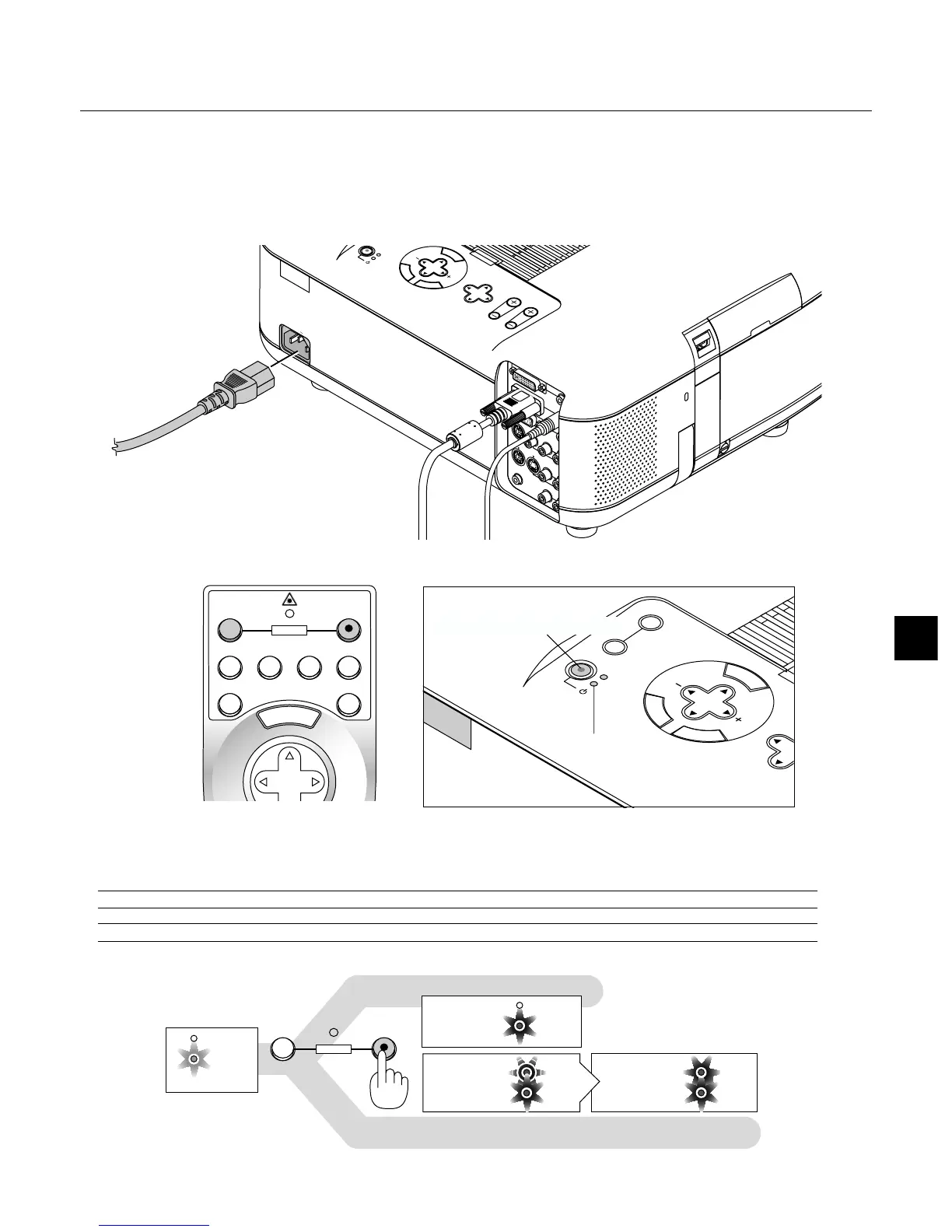 NOTE: To turn the projector on by plugging in the power cable, use the menu and enable the "Auto Start" feature. (See page E-45.)