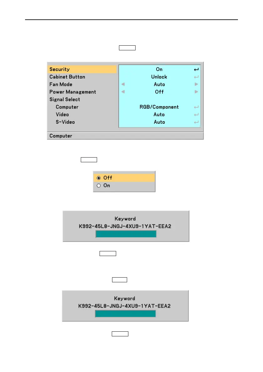 When the correct keyword is entered, the Security function will be disabled.