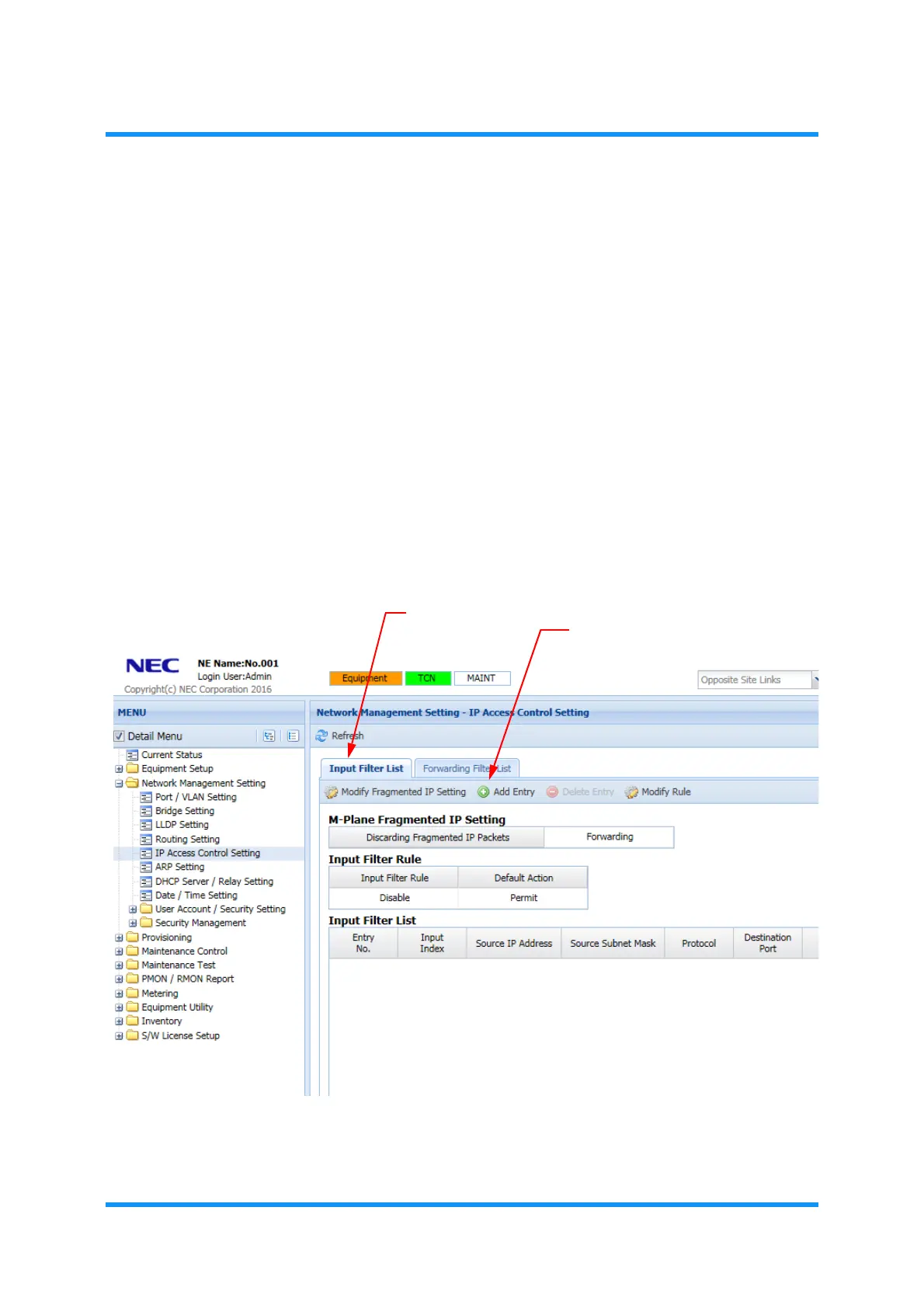 3. In the Input Filter List tabbed page, click the Add Entry tool button on the tool