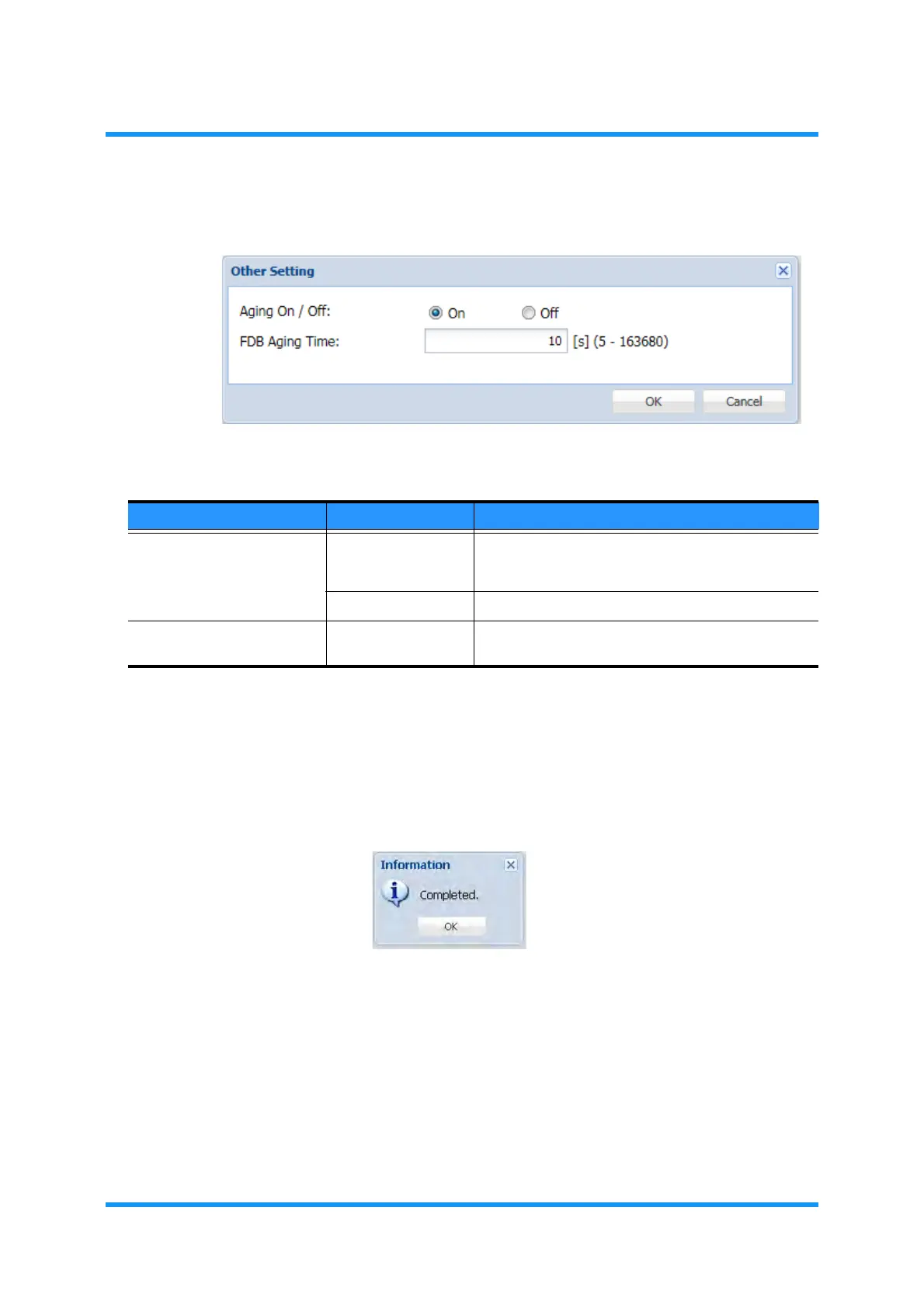 Aging On/Off On Enables the FDB (Forwarding Data Base) to delete