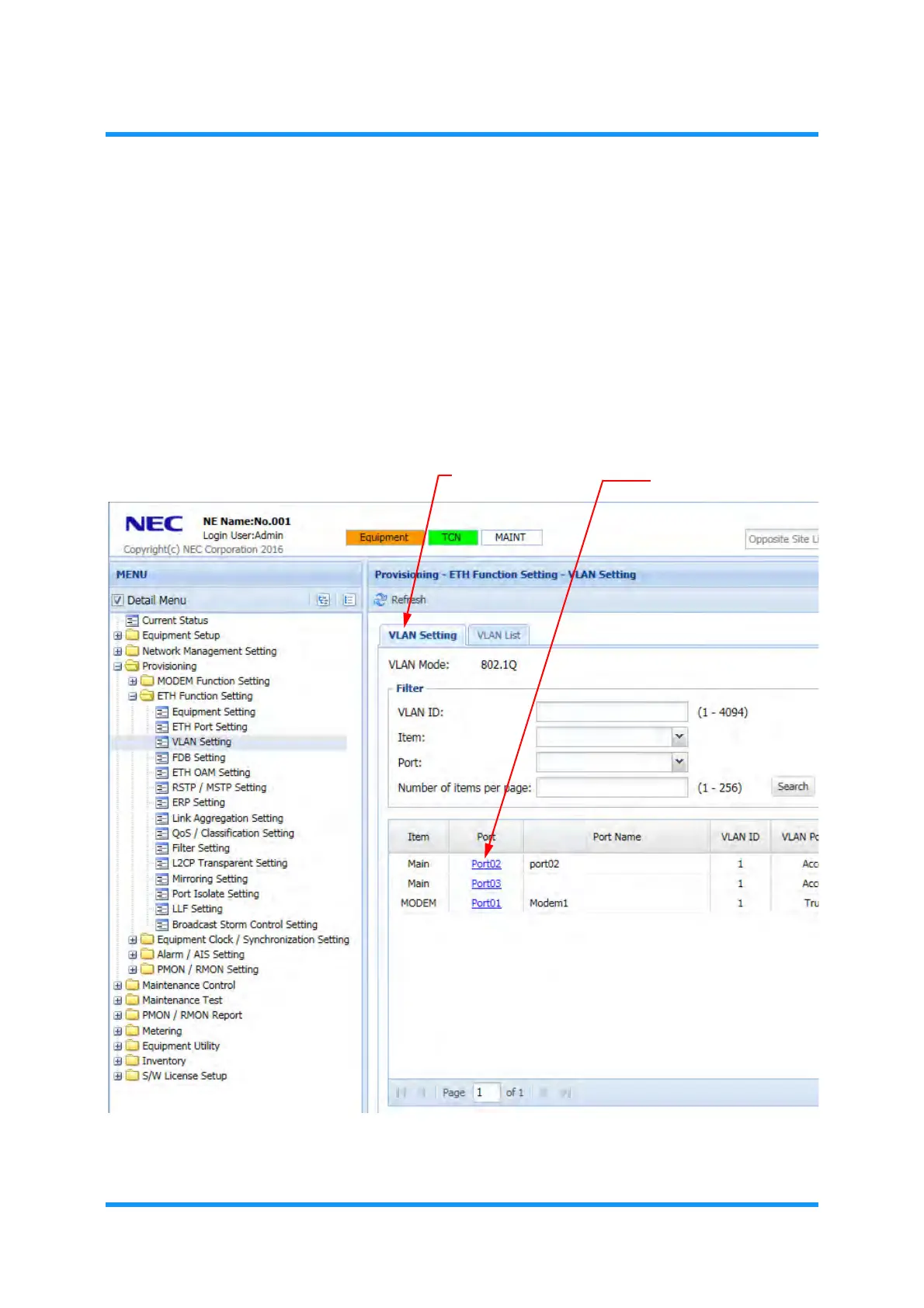 2. In the MENU frame on the left, expand Provisioning, then its submenu ETH