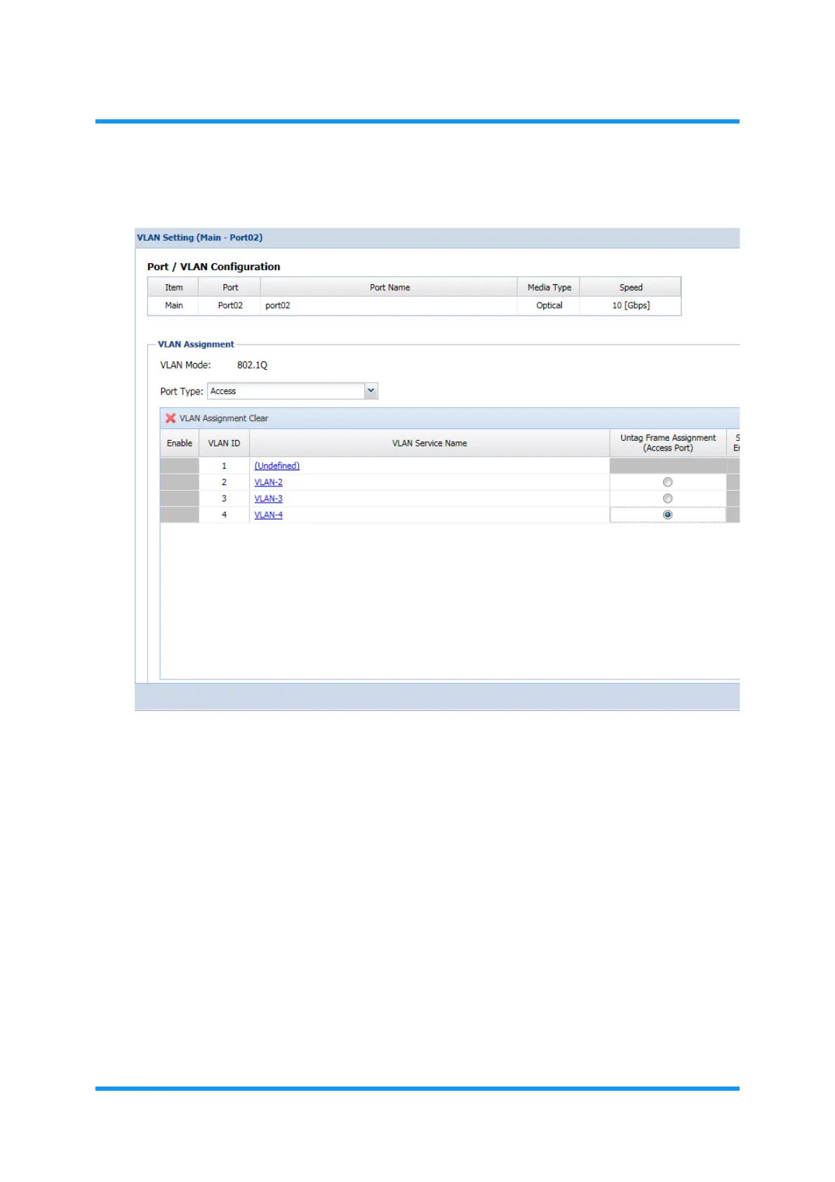 Click a radio button of the target VLAN ID under the Untag Frame Assignment