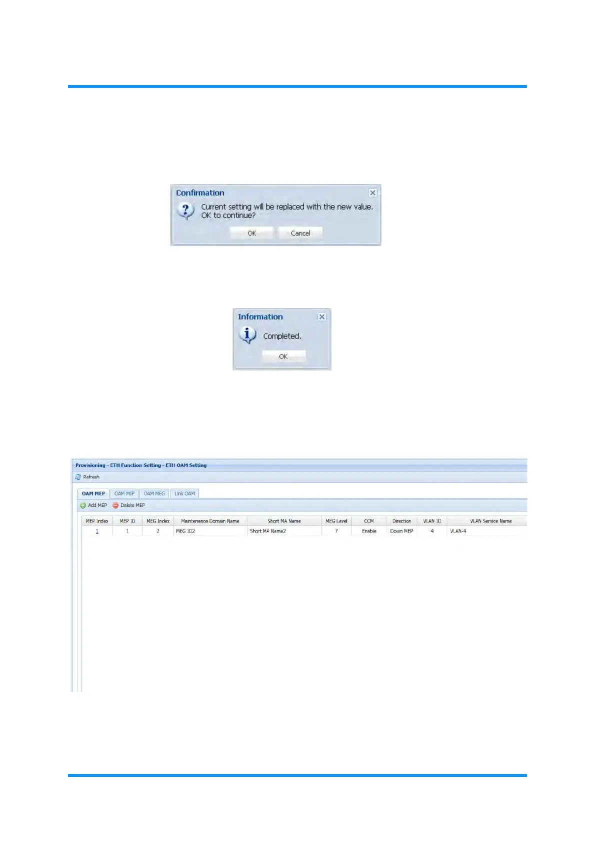 The ETH OAM Setting window updates the information.