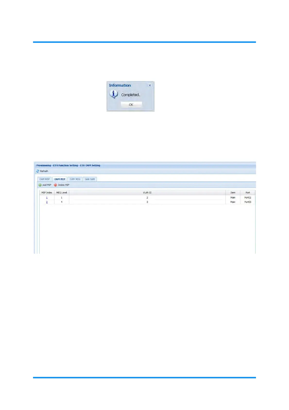 6. ETH OAM Setting window updates the information. Verify the displayed