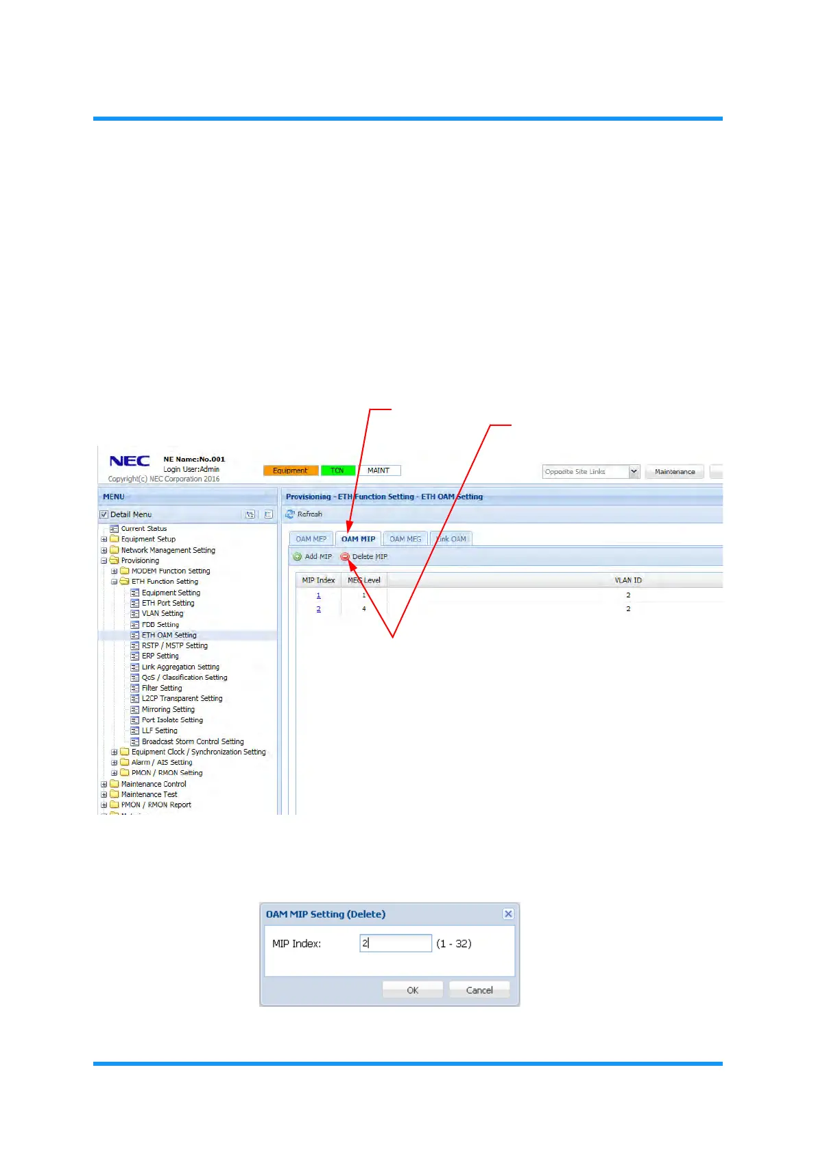 4. OAM MIP Setting (Delete) option window appears. Select the MIP Index number