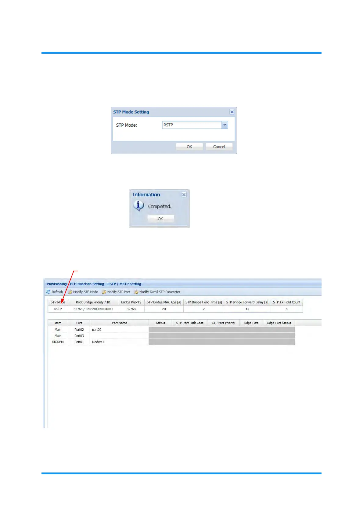 4. The STP Mode Setting option window appears. Select RSTP or MSTP from the