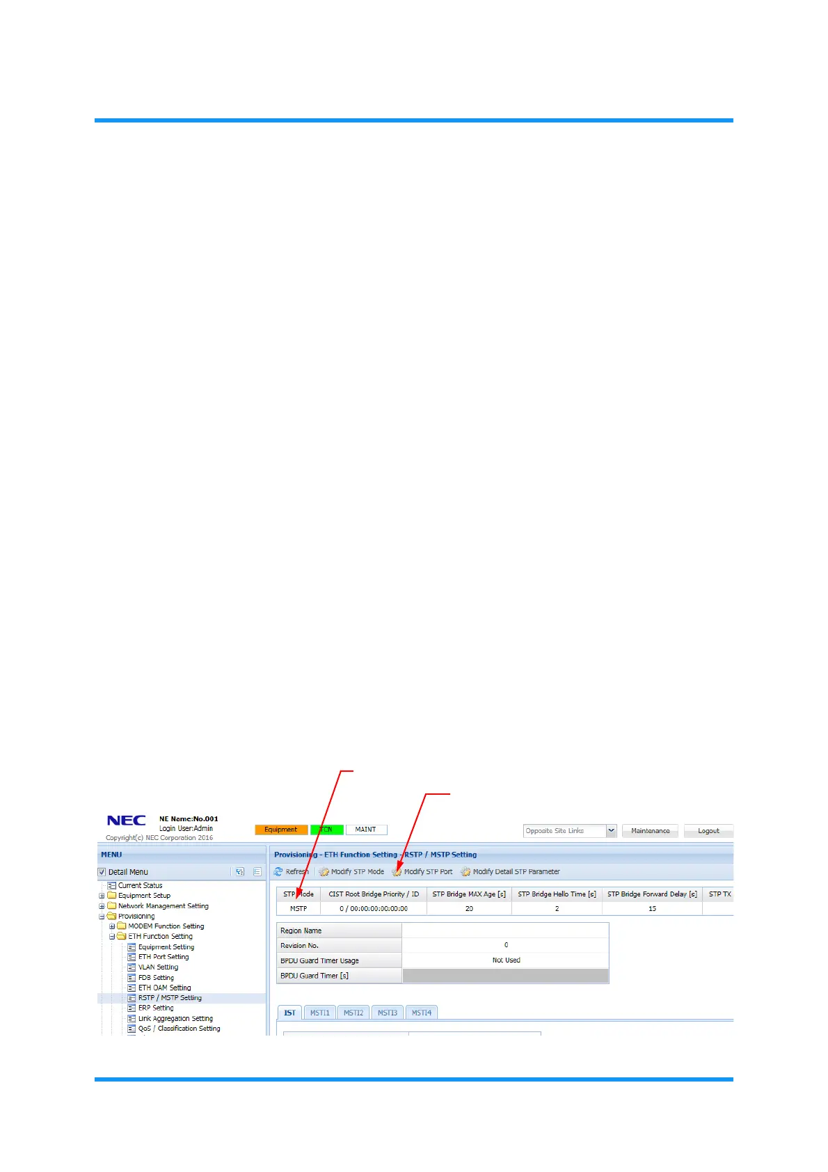If the indicated STP Mode is not MSTP, change the mode using procedure in