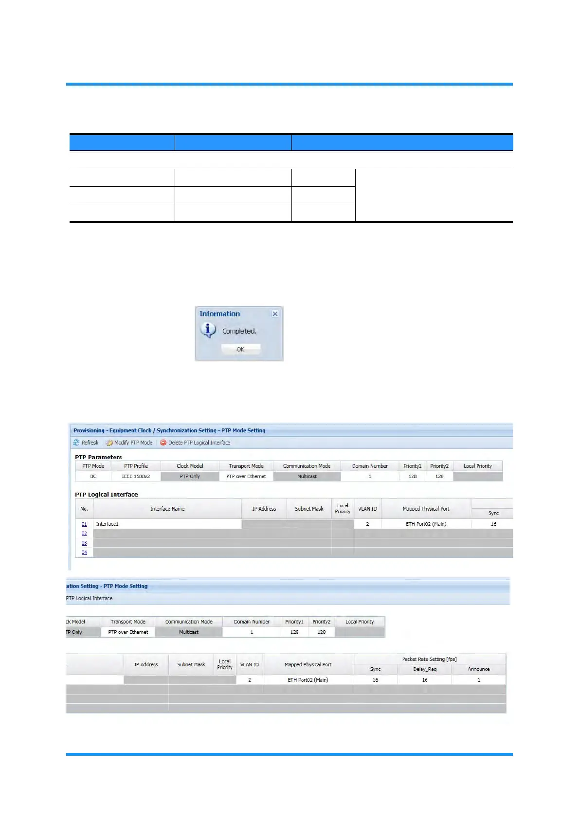 7. The PTP Mode Setting window updates the PTP Logical Interface information.