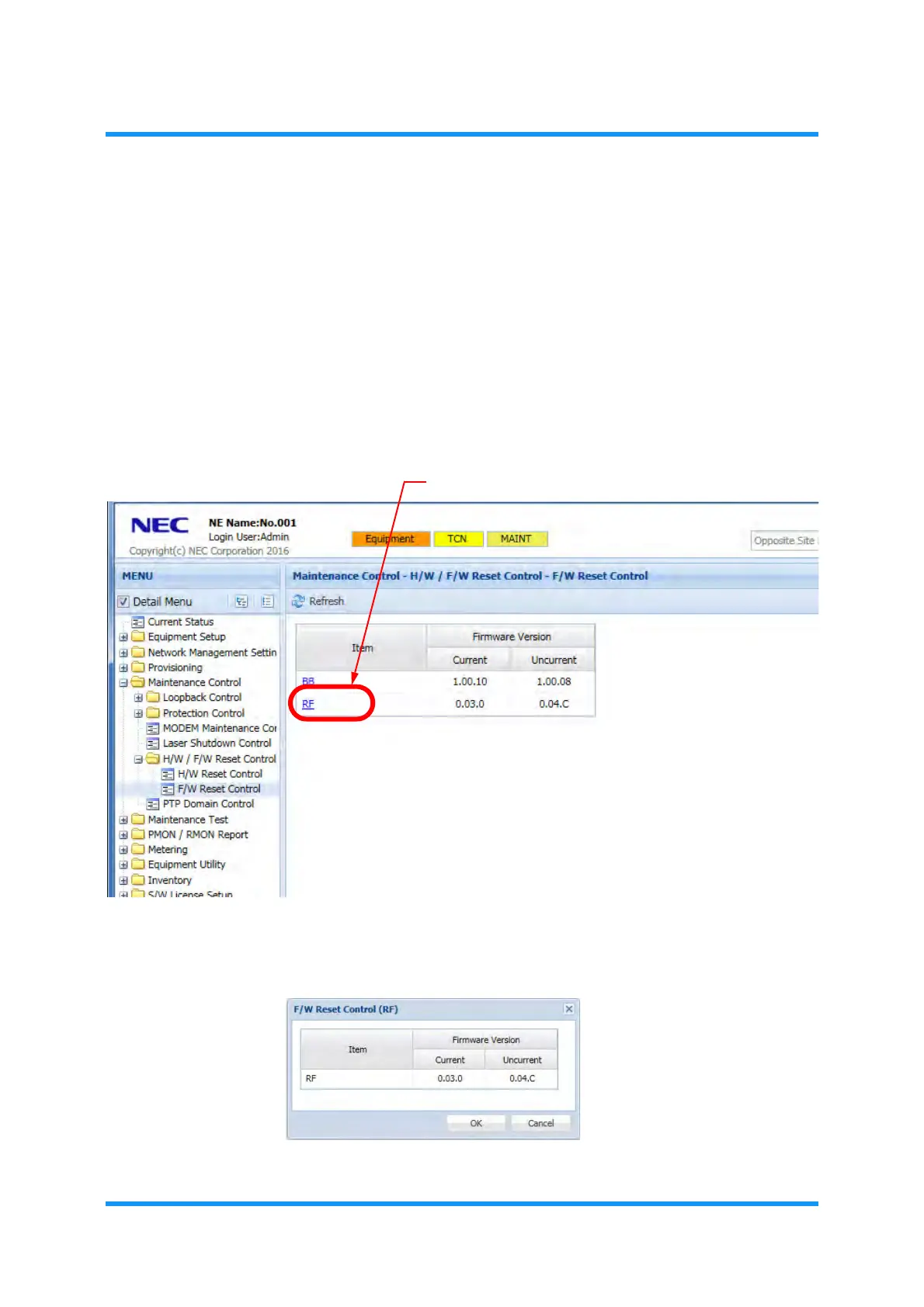 4. F/W Reset Control option window appears. Confirm the information then
