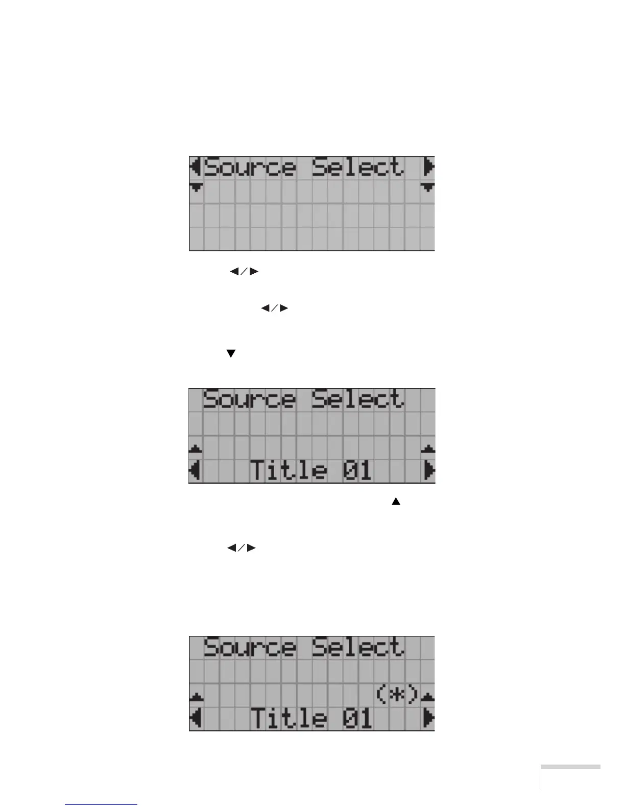 • At each press of the SELECT button, the display will cycle as “Source Select” ←→