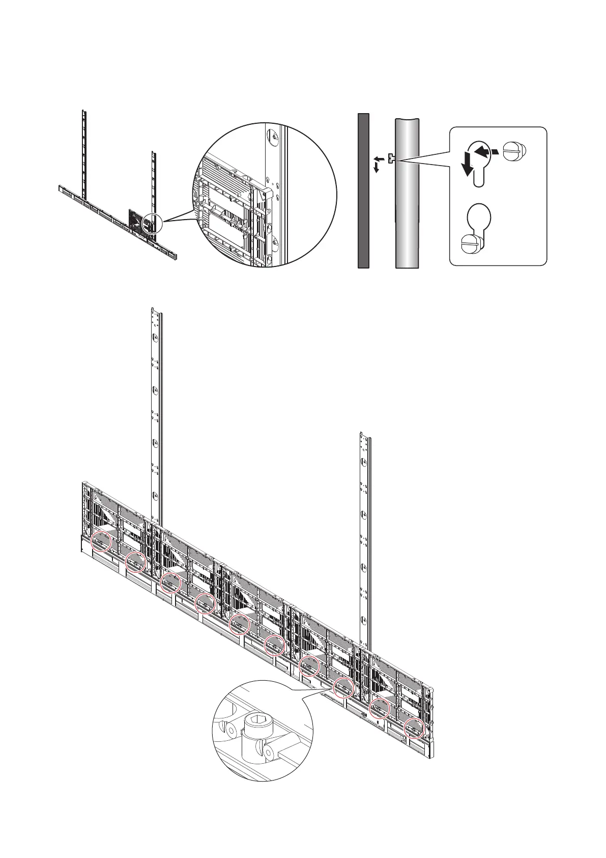 Hook t he hanger pins, which have been insert ed int o t he cabinet s, int o the holes on t he m ount ing bars st art ing