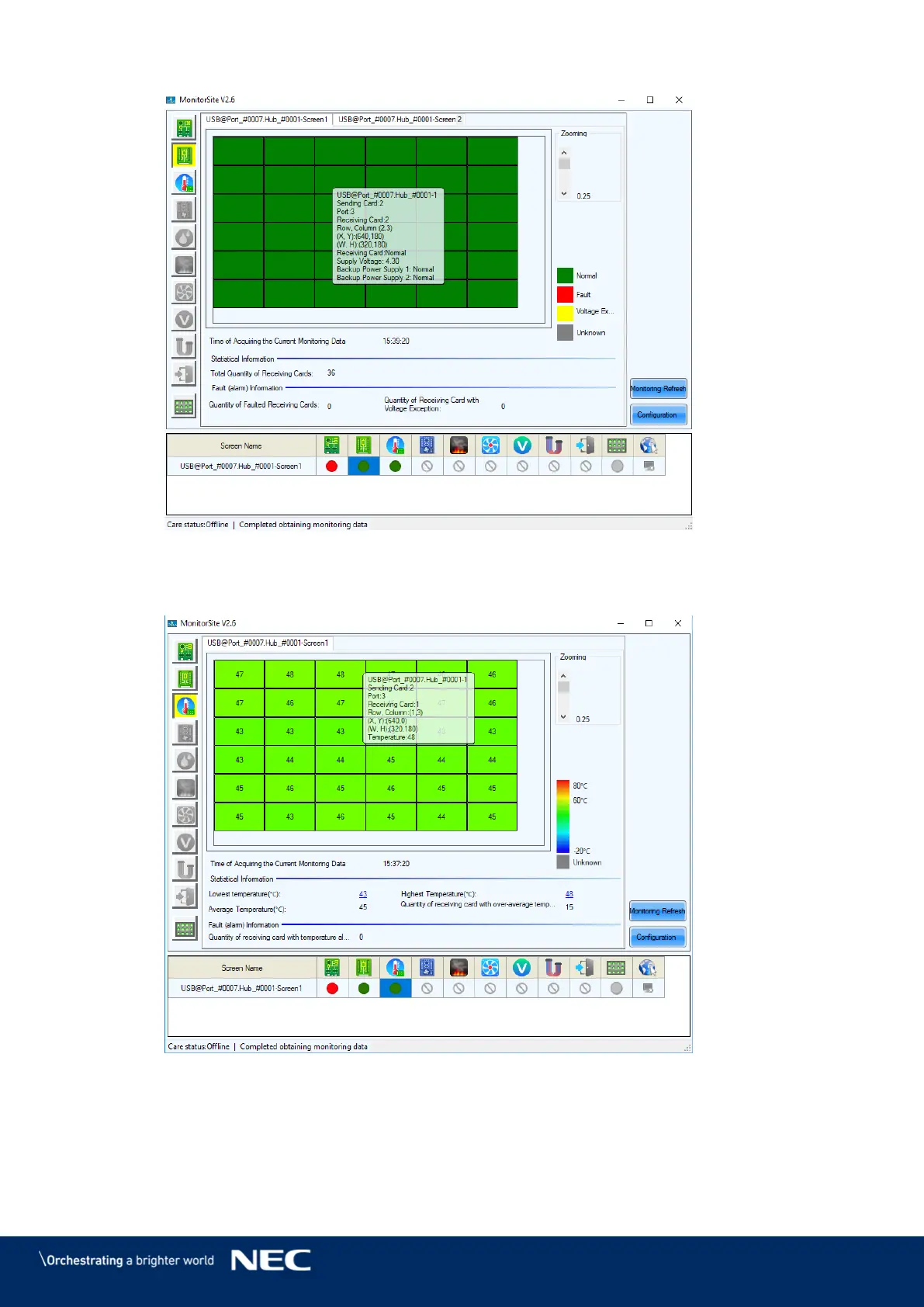 NEC LED-FA025i2-220 - Figure 113: Start Screen Monitoring Receiving Cards and Power Supplies; Figure 114: Start Screen Monitoring Temperature