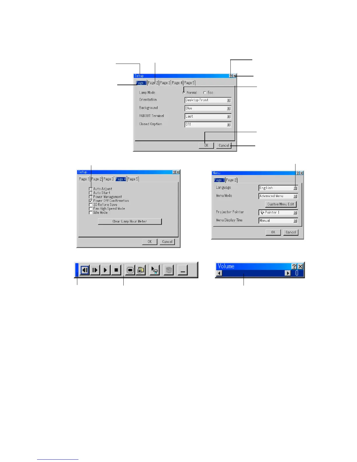 Menu windows or dialog boxes typically have the following elements: