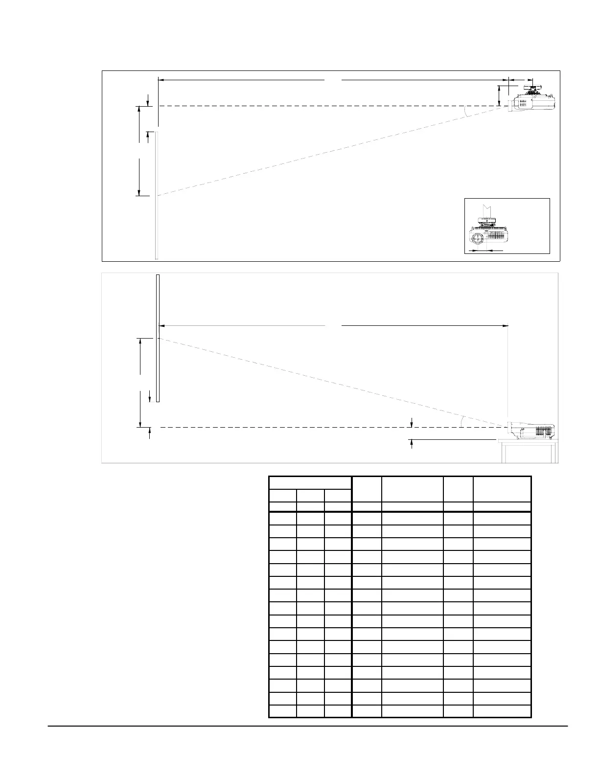 The following diagrams show the relationship between projector position and the screen. Refer to the chart below for data.