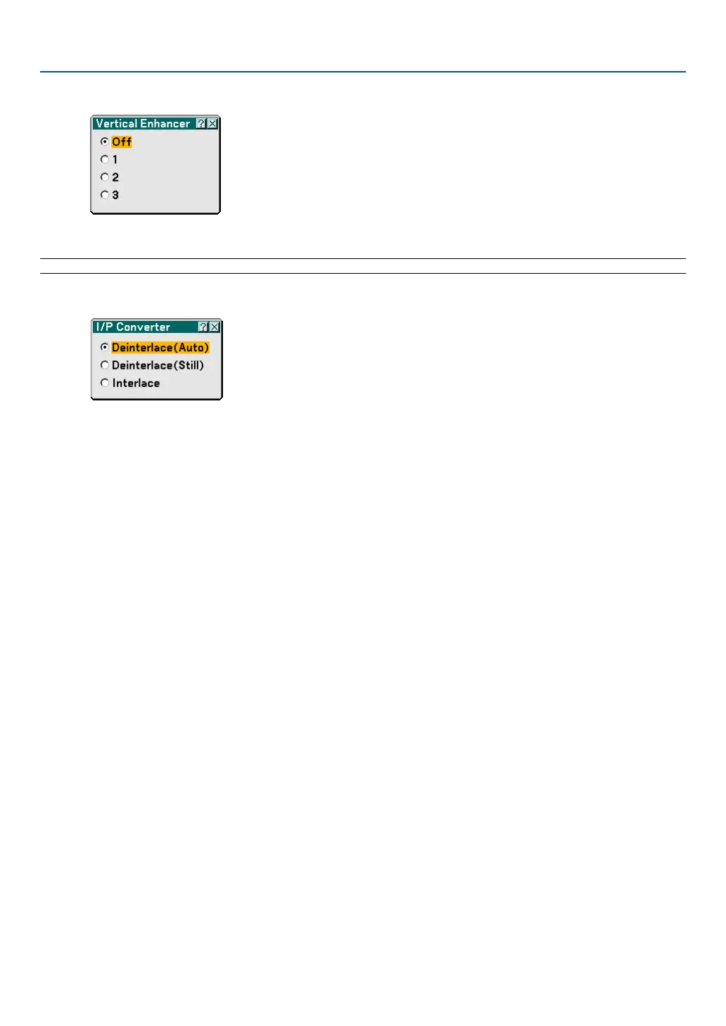 Deinterlace (Auto) ....... The projector automatically determines a still or moving image to display a clear picture. If selecting