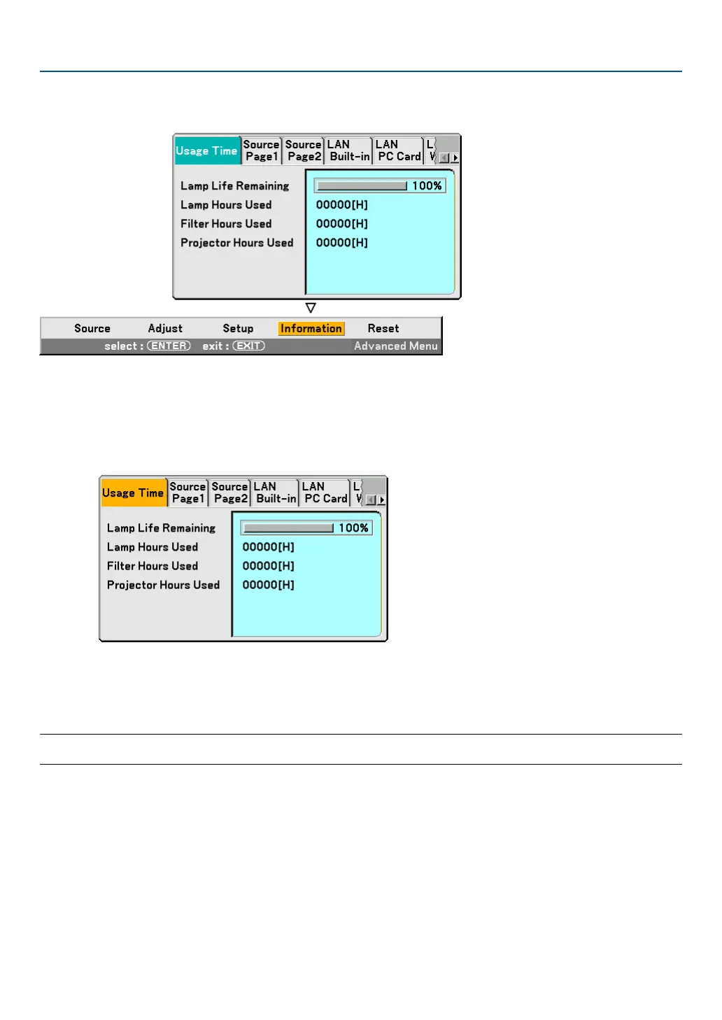 NOTE: The progress indicator shows the percentage of remaining lamp life. The value informs you of the amount of lamp, filter and