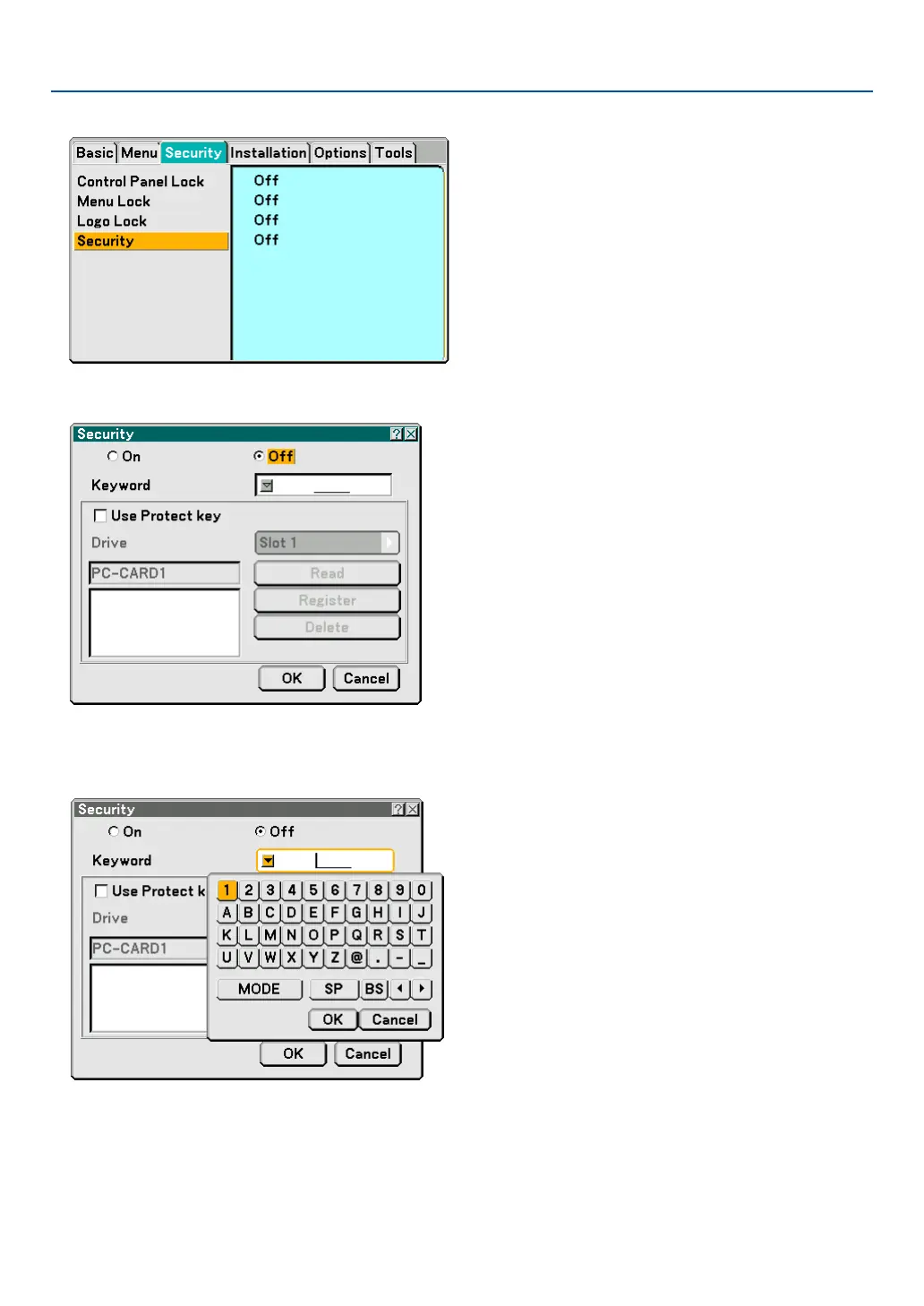 5. Press the ENTER button to display the Security screen.