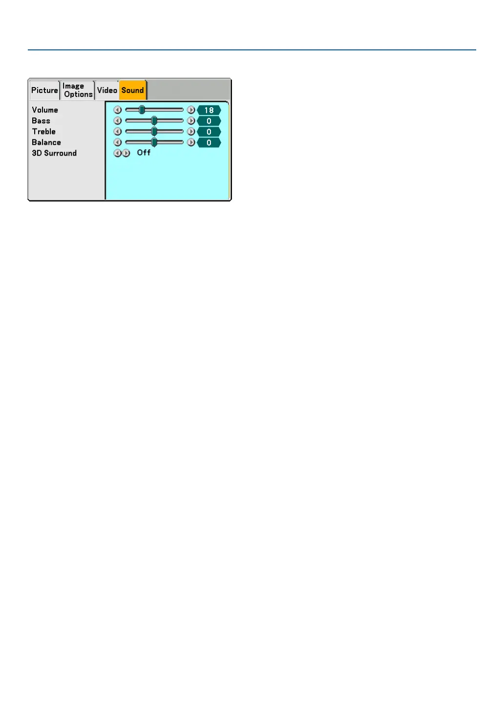 adjustment. If this happnes, return the adjustments of the projector to the factory default (Bass:0, Treble: 0, 3D Sur-