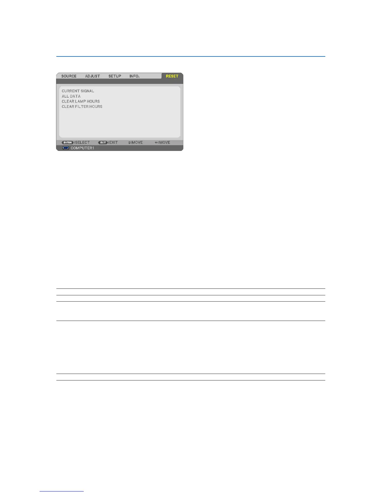 LAMPHASREACHEDTHEENDOFITSLIFE)NTHISCONDITIONYOUCANNOTCLEARTHELAMPHOURMETERONTHEMENU)FTHISHAPPENSPRESSTHE