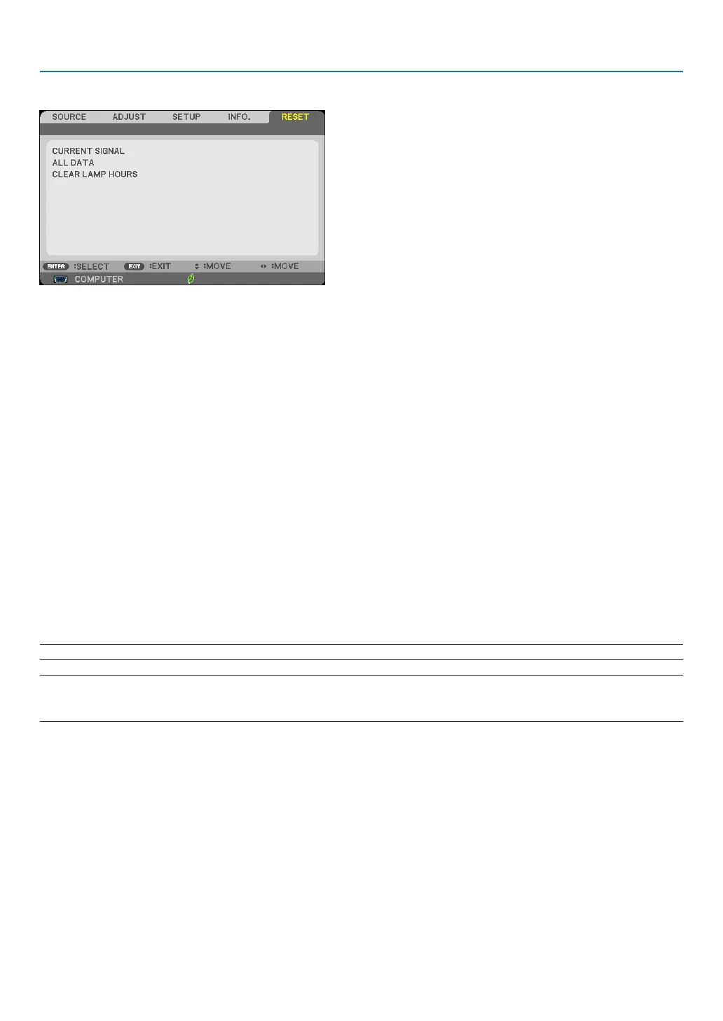NOTE:Elapsedtimeofthelampusewillnotbeaffectedevenwhen[RESET]isdonefromthemenu.