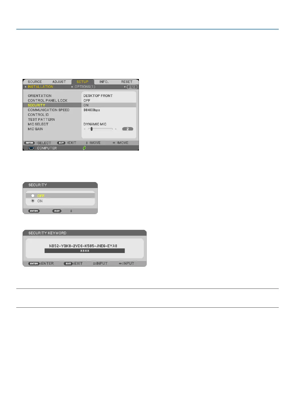 2.Select[SETUP]→[INSTALLATION]→[SECURITY]andpresstheENTERbutton.