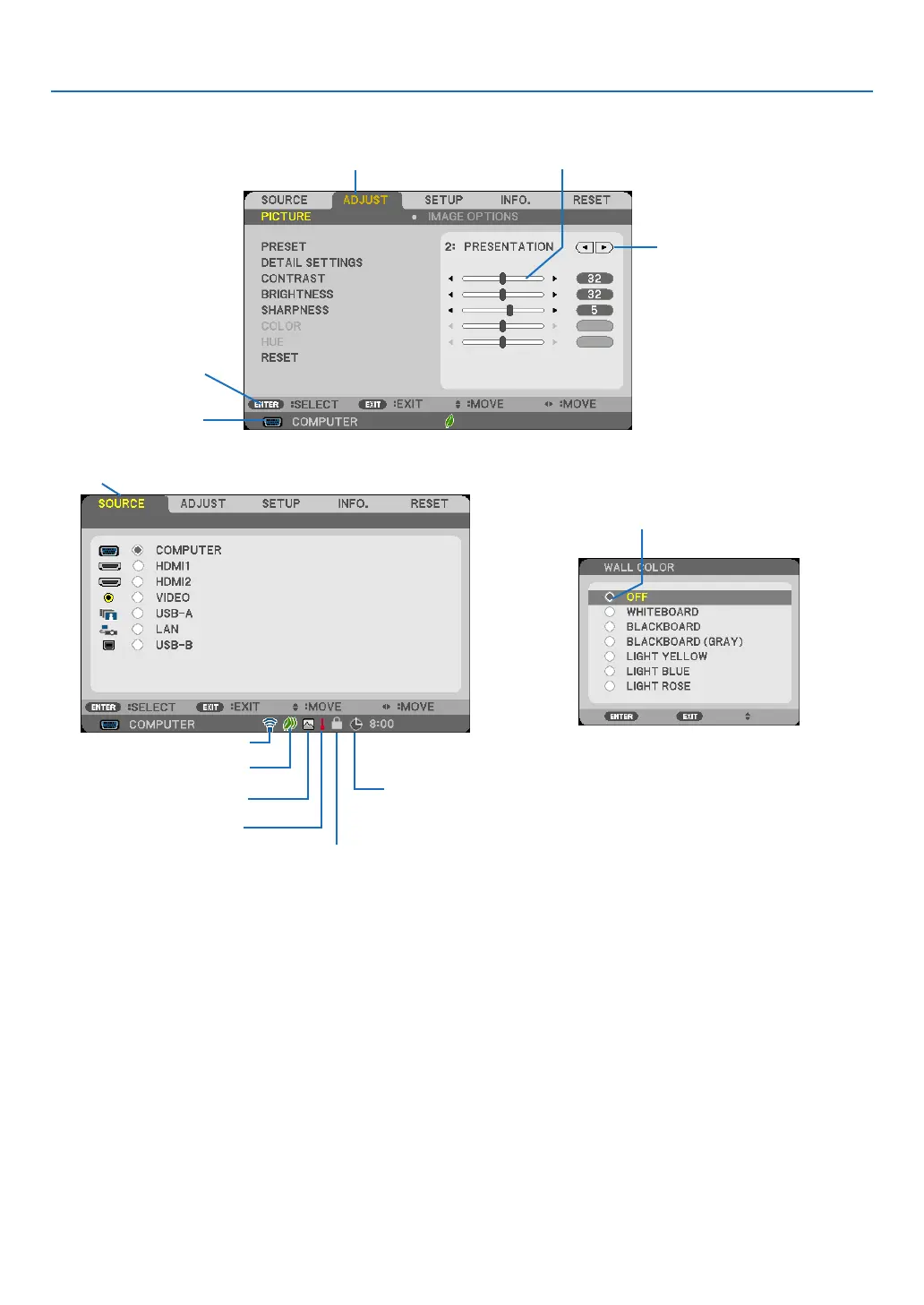 Slide bar �����������������������������Indicates settings or the direction of adjustment�