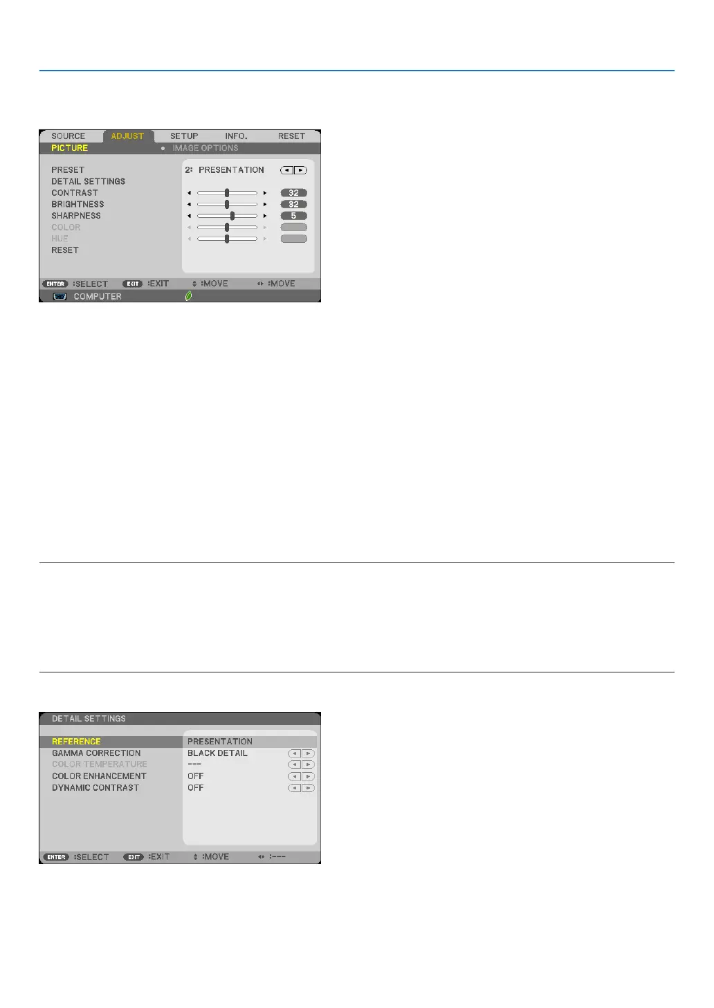TURE]→[PRESET]andsettooneoftheitemsotherthan[HIGH-BRIGHT]and[PRESENTATION].