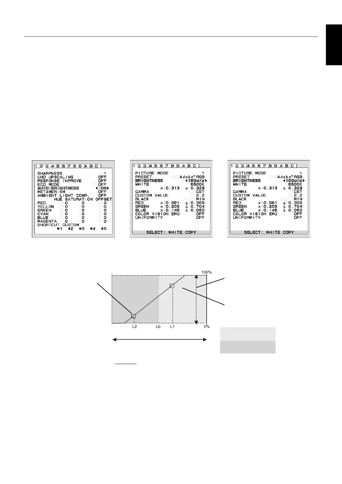 L1: BRIGHTNESS level set for the monitor to use when ambient lighting level is high (L1>Lb)