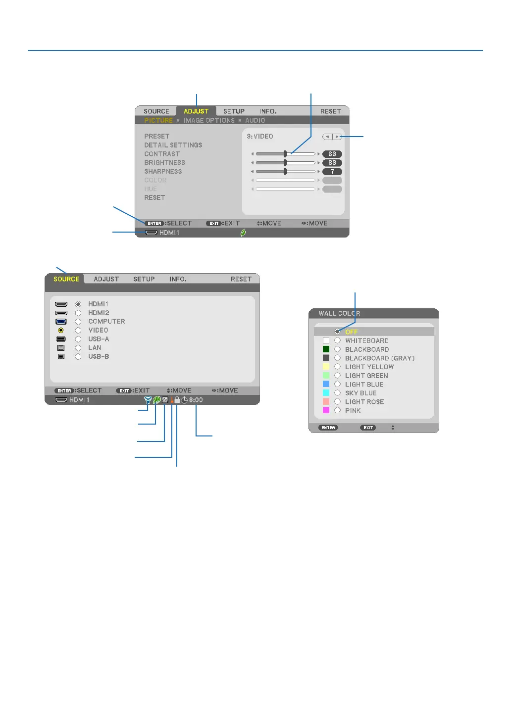 Slide bar �����������������������������Indicates settings or the direction of adjustment�