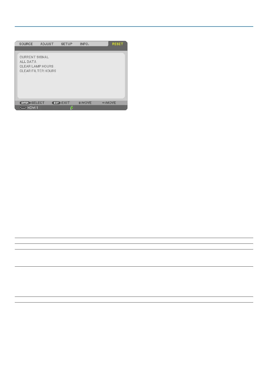 NOTE:Elapsedtimeofthelampusewillnotbeaffectedevenwhen[RESET]isdonefromthemenu.