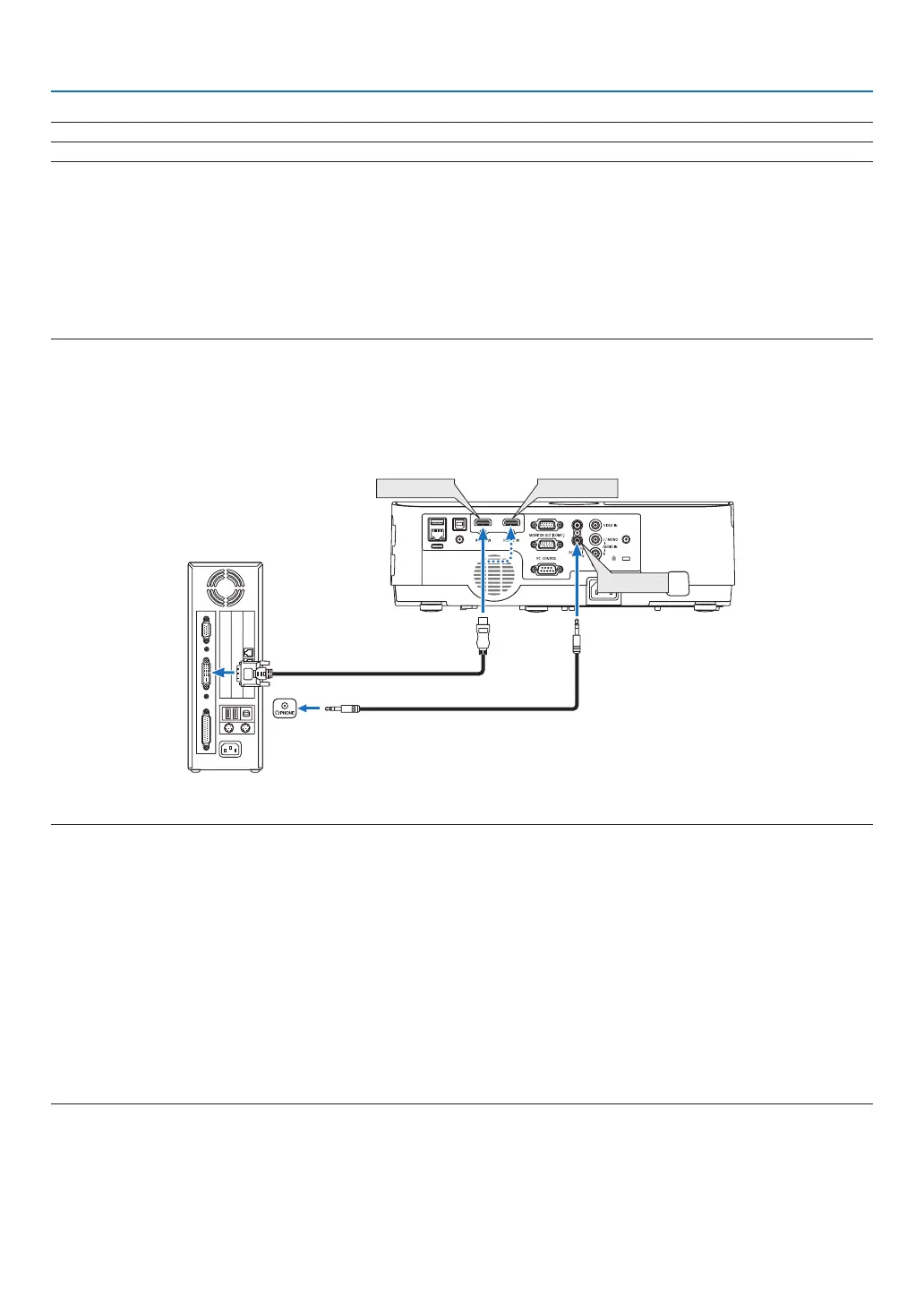 • ToprojectaDVIdigitalsignal:Connectthecables,turntheprojectoron,thenselecttheHDMIinput.Finally,turnonyourPC.