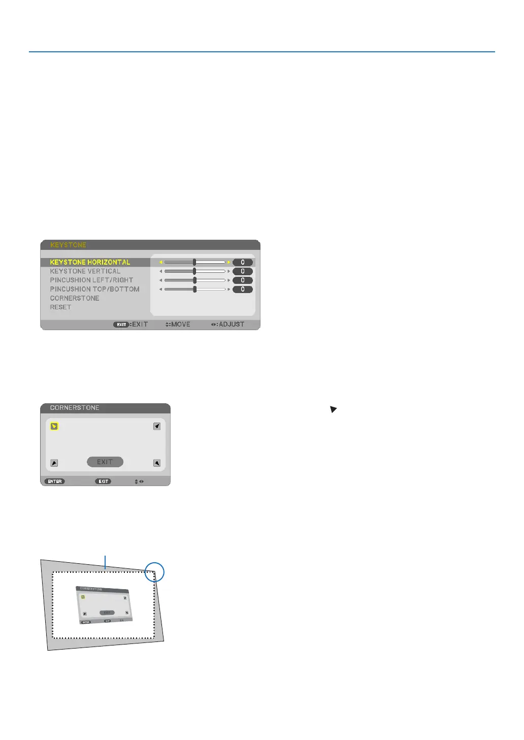 Usethe[CORNERSTONE]and[PINCUSHION]featurestocorrectkeystone(trapezoidal)distortiontomakethetop