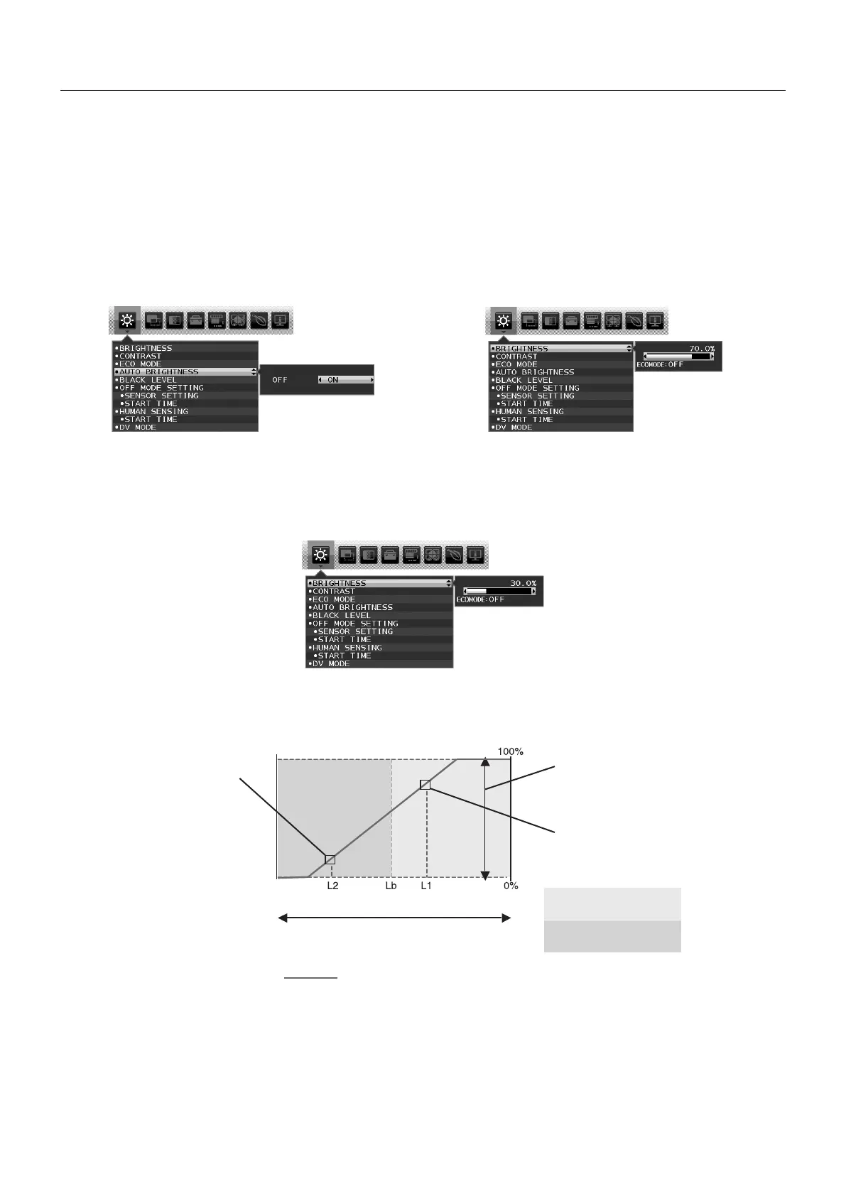 L2 : BRIGHTNESS level set for the monitor to use when ambient lighting level is low (L2<Lb)