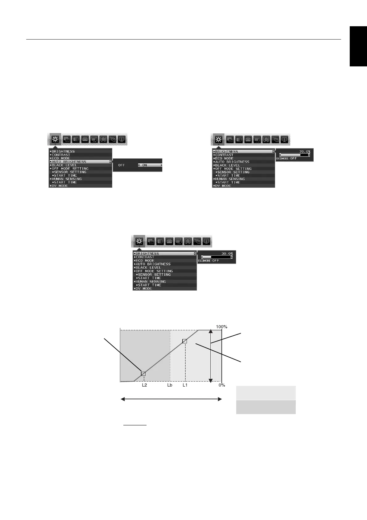 L1: BRIGHTNESS level set for the monitor to use when ambient lighting level is high (L1>Lb)