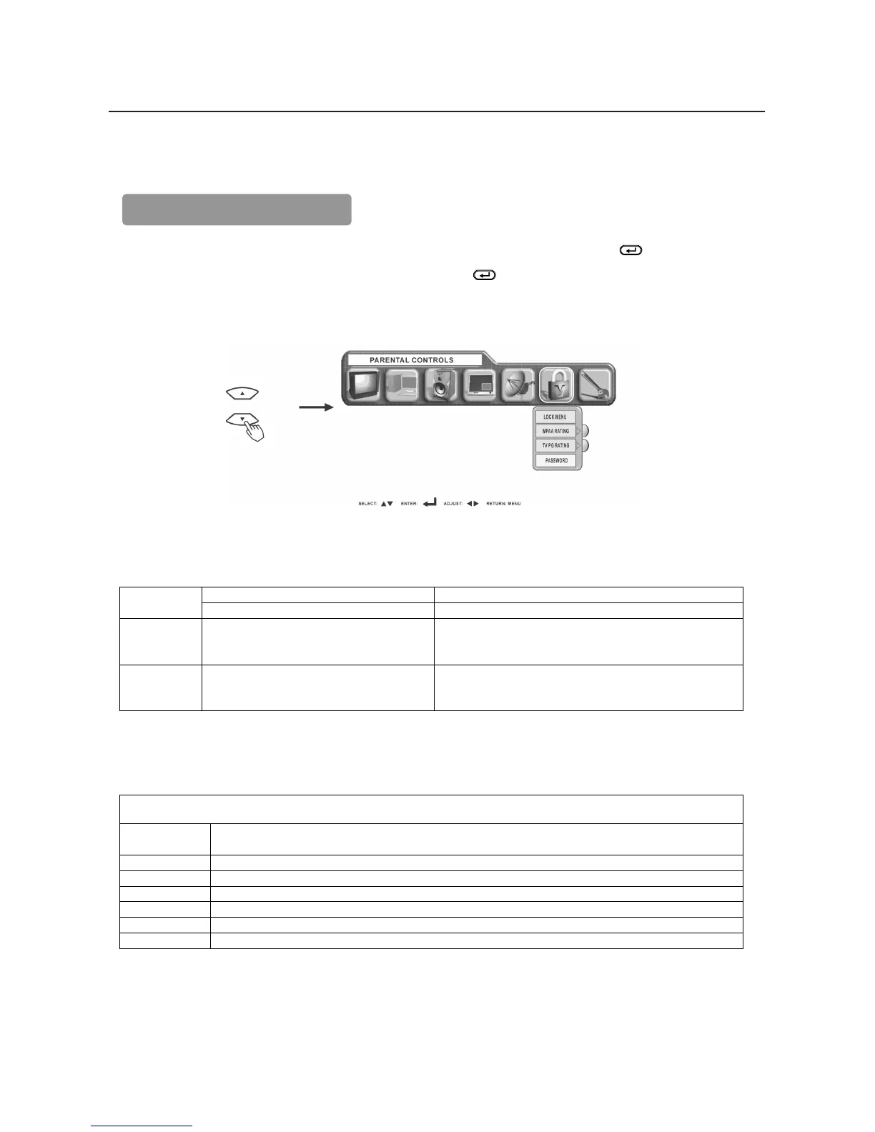 1.Press “MENU” button and select PARENTAL CONTROLS menu with the W X PROGRAM ADJUST buttons, then press the ENTER