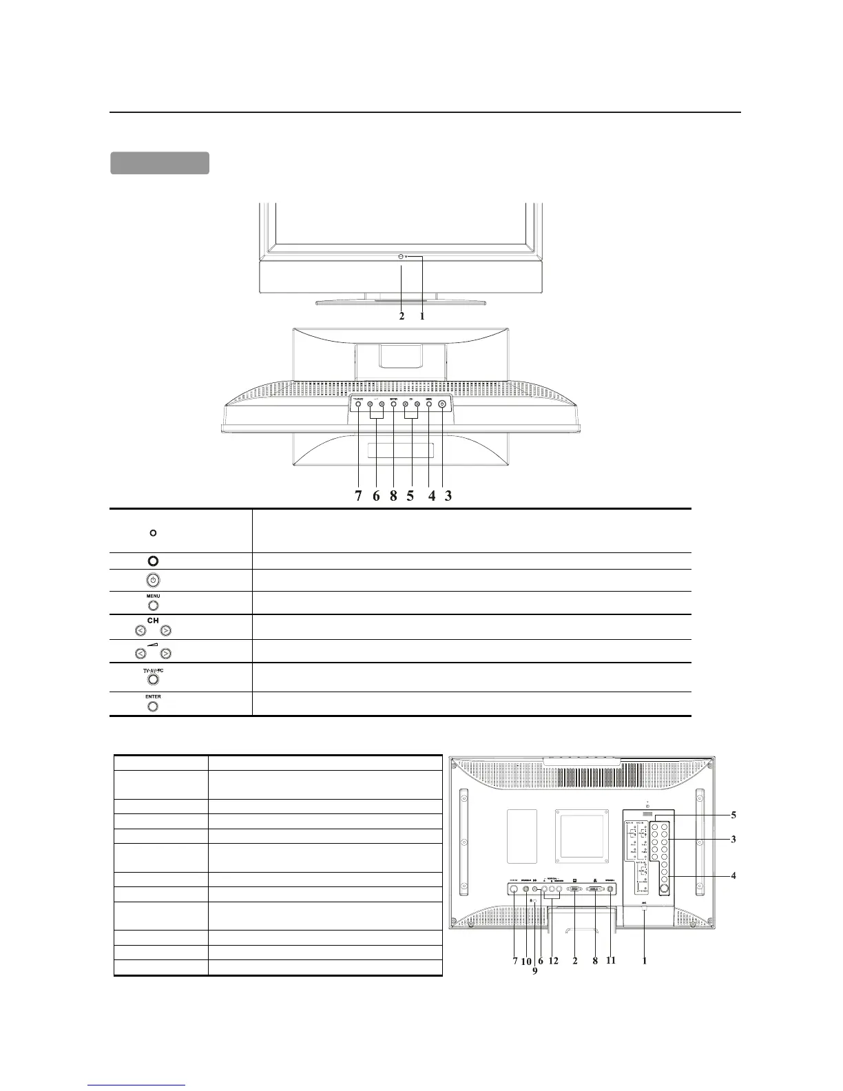 Channel Select the next lower channel / higher channel (TV/AV mode) ; OSD function for selecting (PC mode).