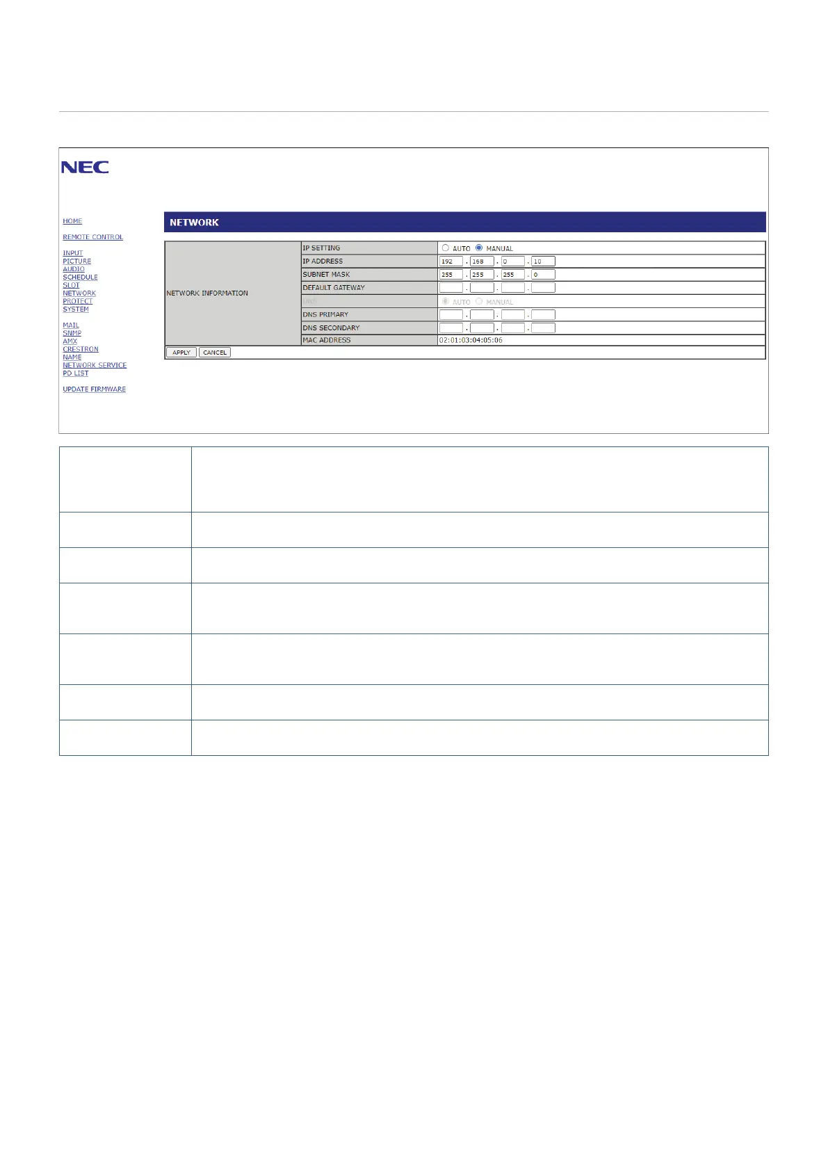 DEFAULT GATEWAY Set your default gateway for the monitor connected to the network when [MANUAL] is selected for