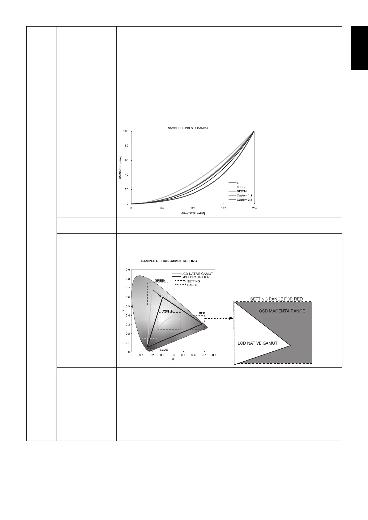 Adjusts color gamut. When the selected settings are outside of the LCD gamut, the