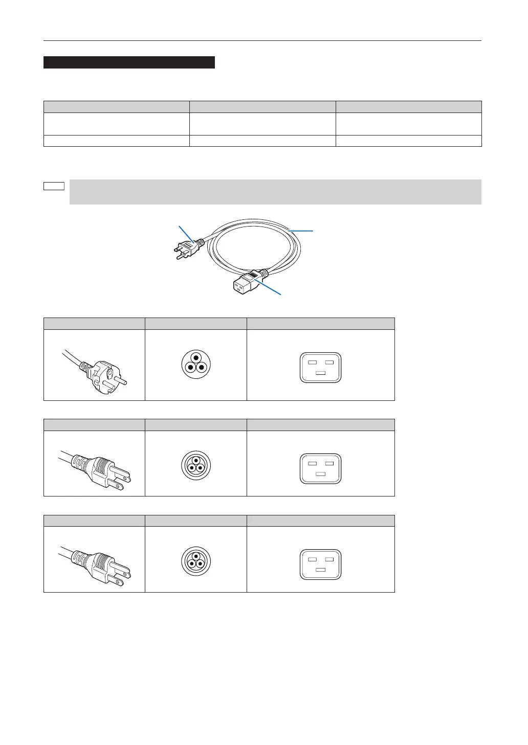 Furthermore, use plugs, cables, and connectors that are suitable for the regulations of the country of installation, as shown in the