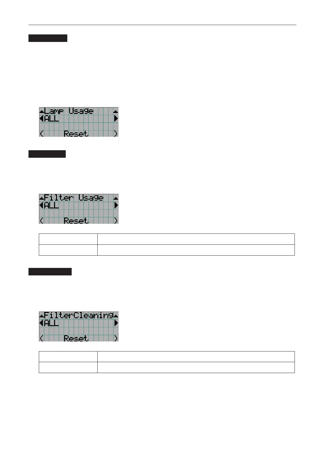 Resets the lamp usage time. When both lamp 1 and lamp 2 are replaced at the same time, reset the usage times of both lamp 1