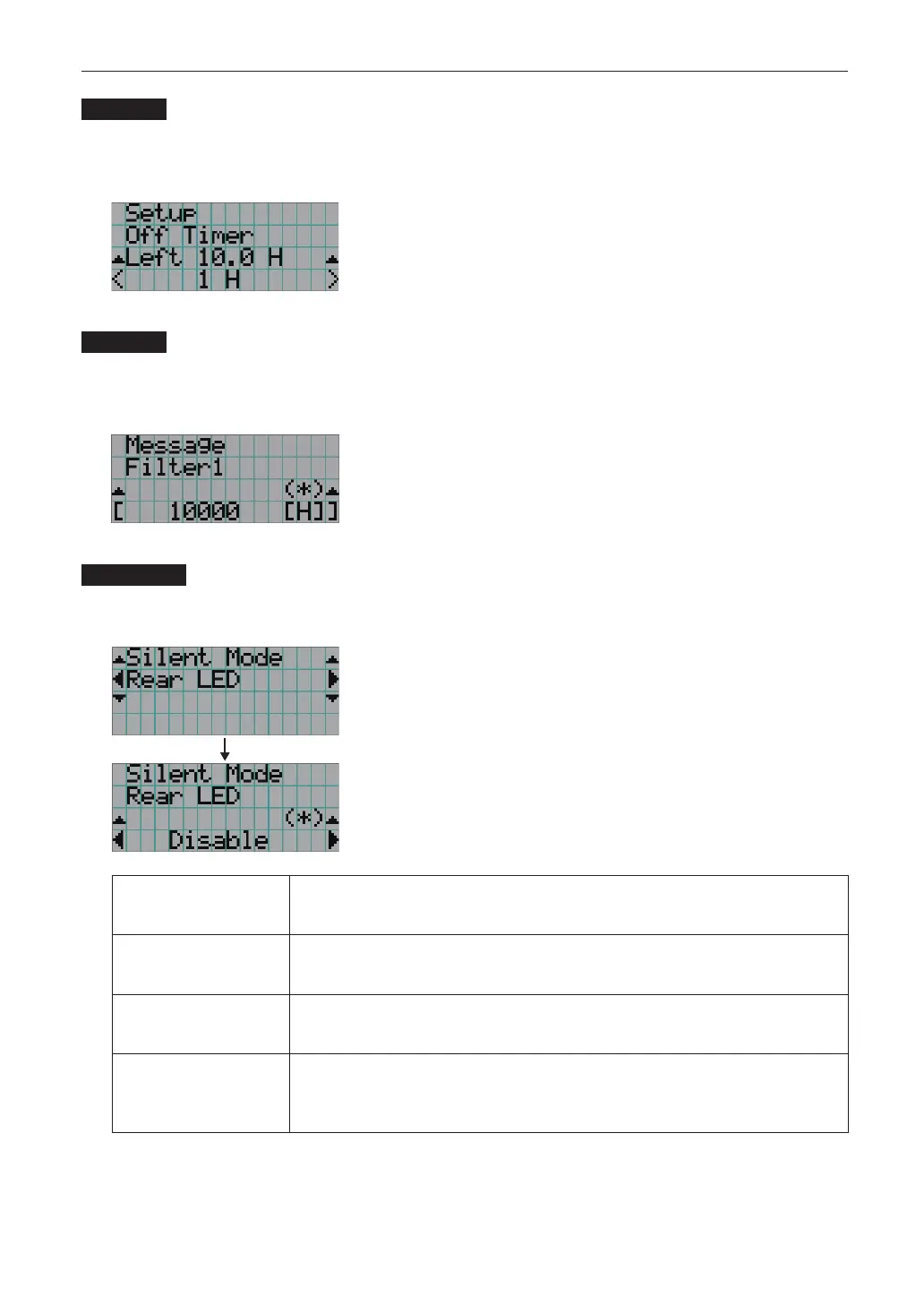 the message (“Filter Time Over”) is displayed on the LCD screen. The default setting is set to “0 (-----) [H]”. In this setting, “Filter