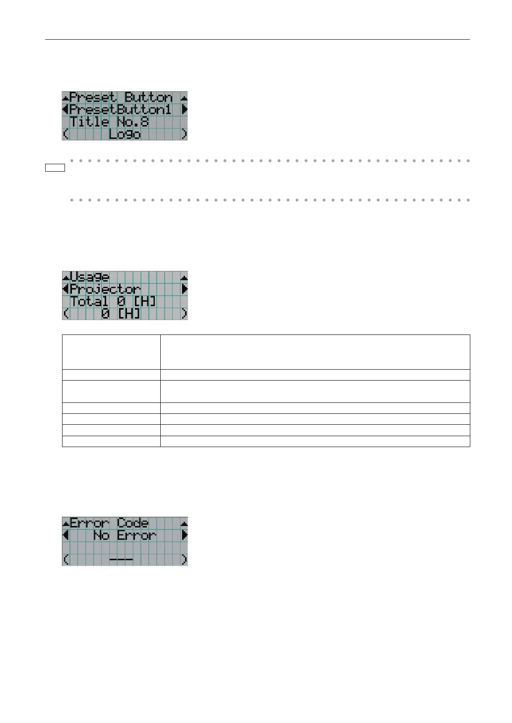 Projector Displays the usage time of the projector.