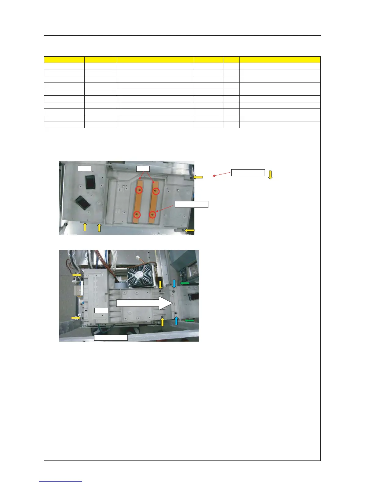 Then, tighten screws from the side (green arrow mark). Finally, tighten screws (yellow arrow mark) that are intended for