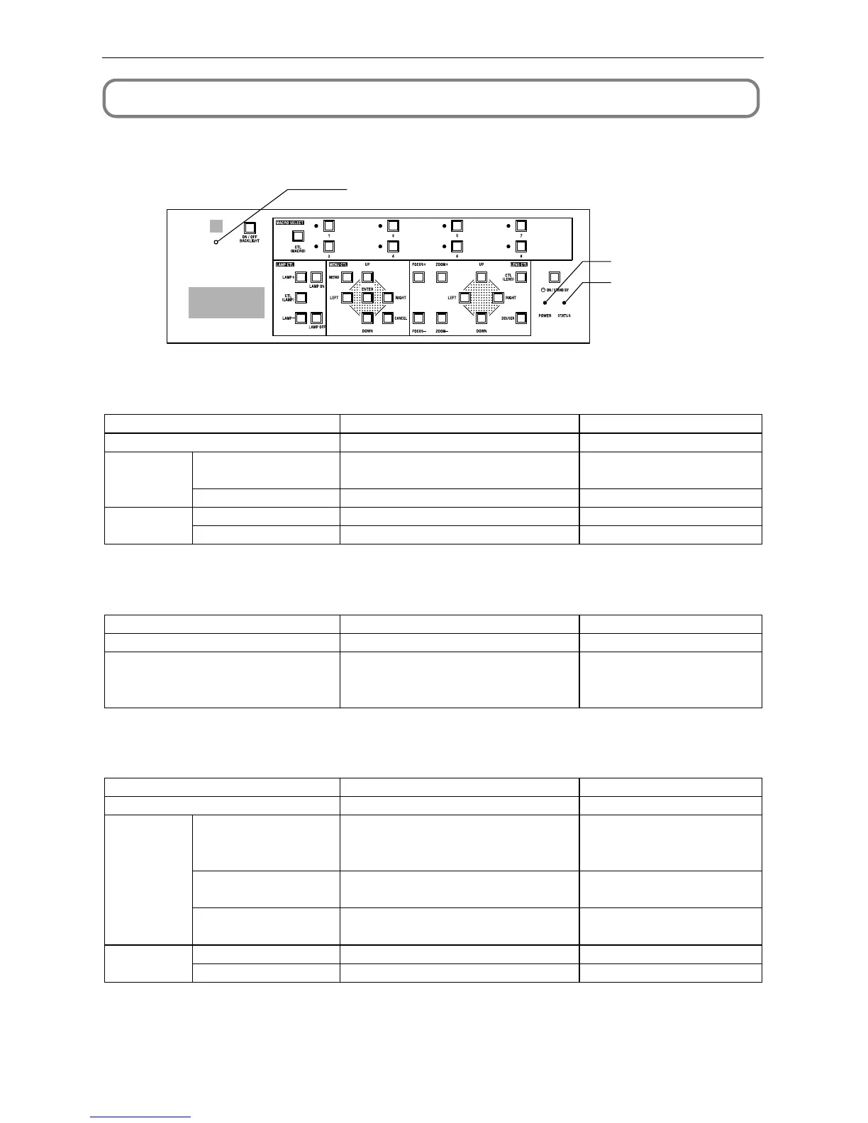 STATUS indicator on the backside of the projector is observed. The projector also has a warning function that uses a buzzer.