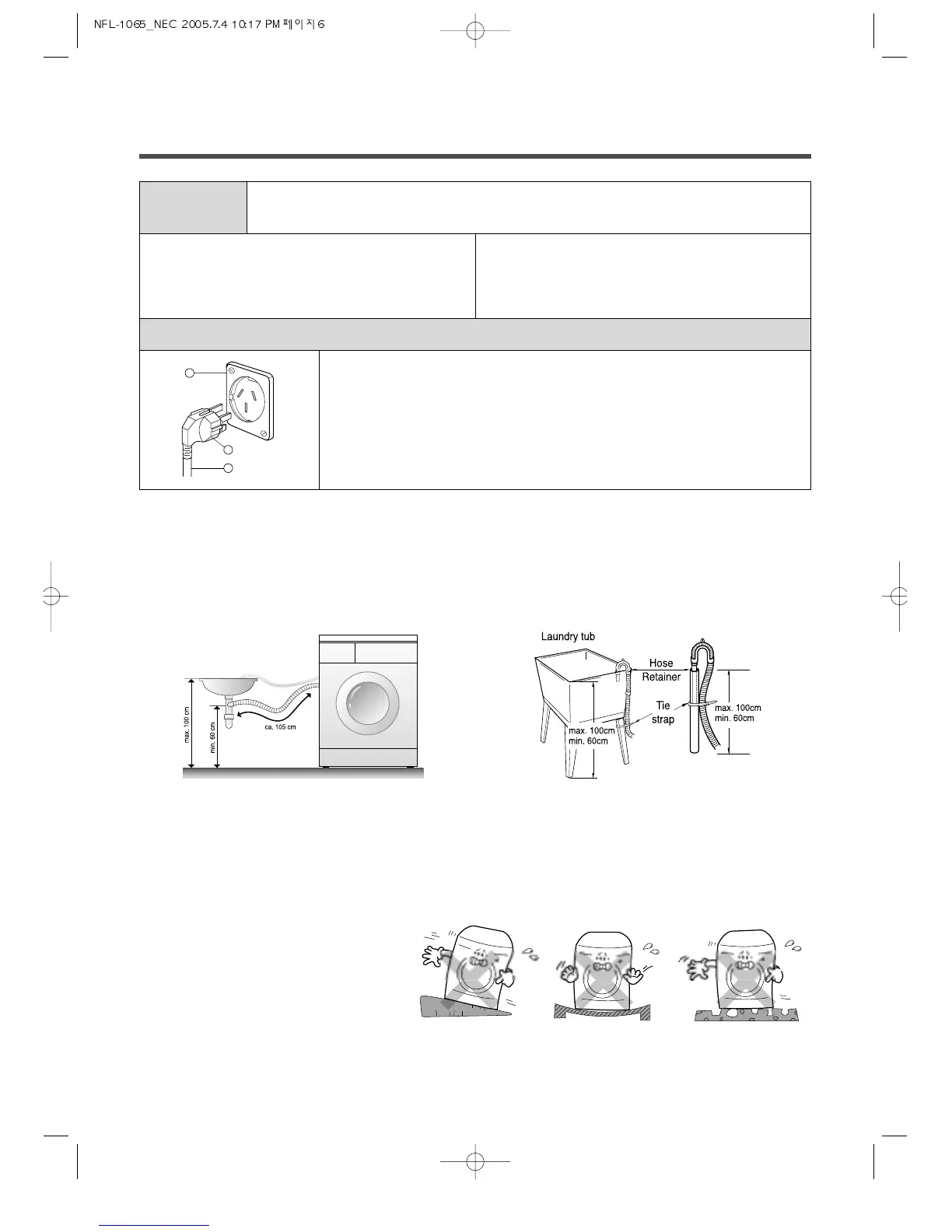 • Proper securing of the drain hose will protect the floor from damage due to water leakage.