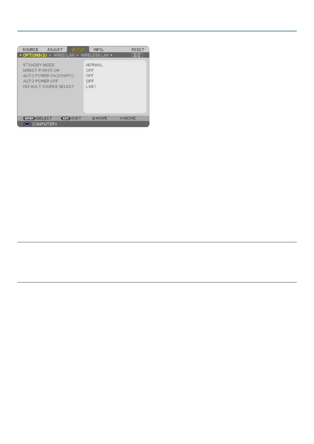 • When[CONTROLPANELLOCK],[CONTROLID],or[AUTOPOWERON(COMP1)]isturnedon,the[STANDBYMODE]settingis
