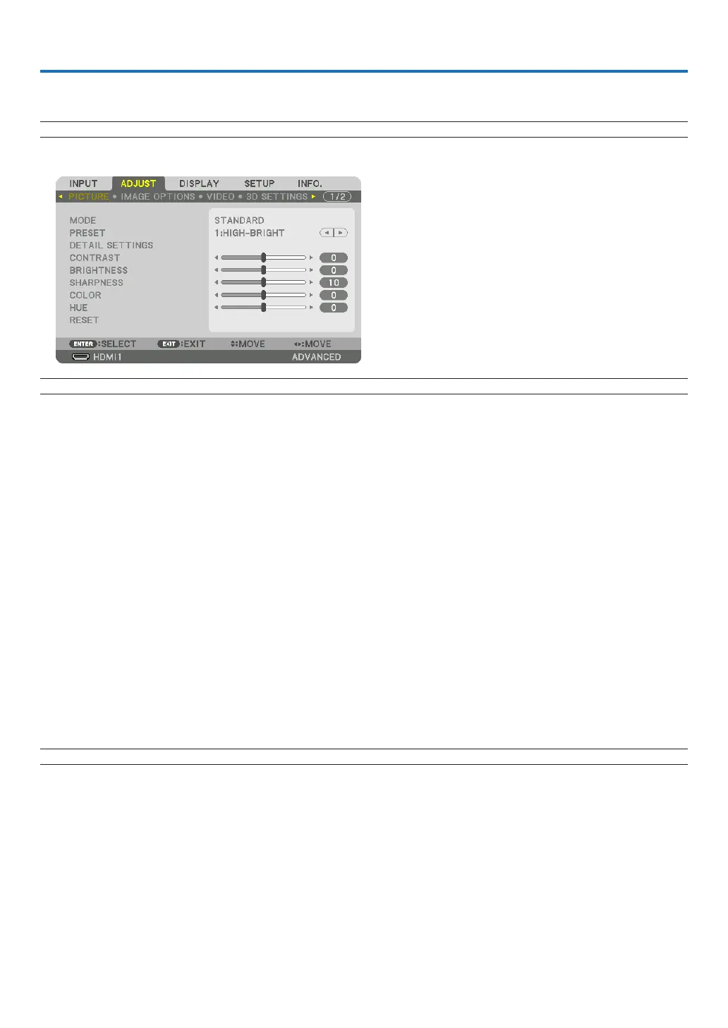 7. Repeatsteps2-6toadjustanadditionalitem,orpresstheEXITbuttonontheremotecontrolortheprojector