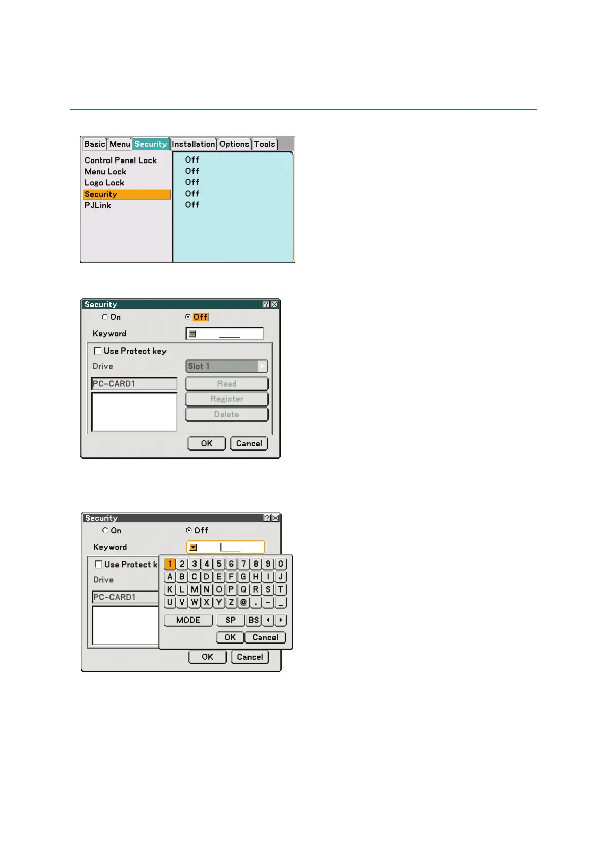 5. Press the ENTER button to display the Security screen.